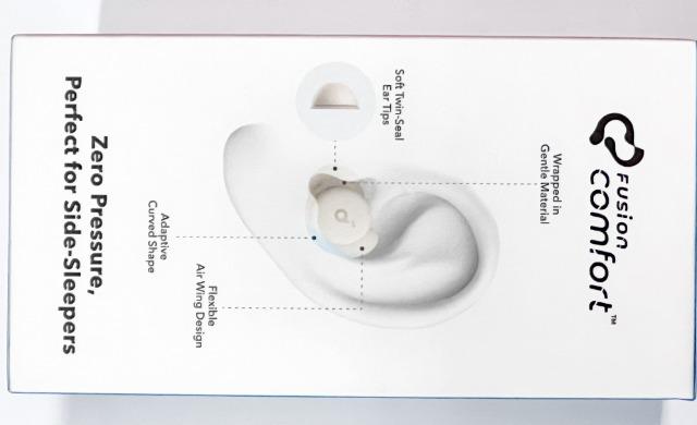 而關于產品的幾大亮點及佩戴效果圖,全部被放在了包裝盒的兩個側面,簡言之包括:長續航、睡眠監測、自帶白噪音、查找設備,以及零壓佩戴側睡。這些個亮點,正好能夠滿足一場高質量睡眠所需要的條件。