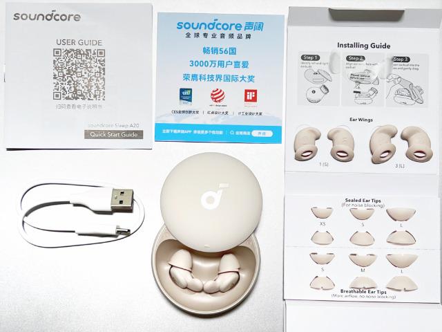 拆開包裝后,里面除了聲闊睡眠耳機外,還附送幾對耳翼和耳帽,很周到。清點下來包括以下物件:耳機主體、充電盒、耳翼*3、封閉式隔音耳帽*4、開放式耳帽*3、充電線*1,以及一份使用指南,如下圖。