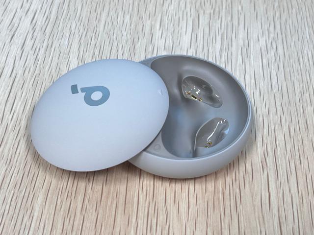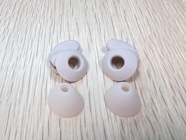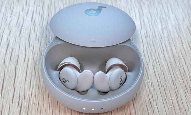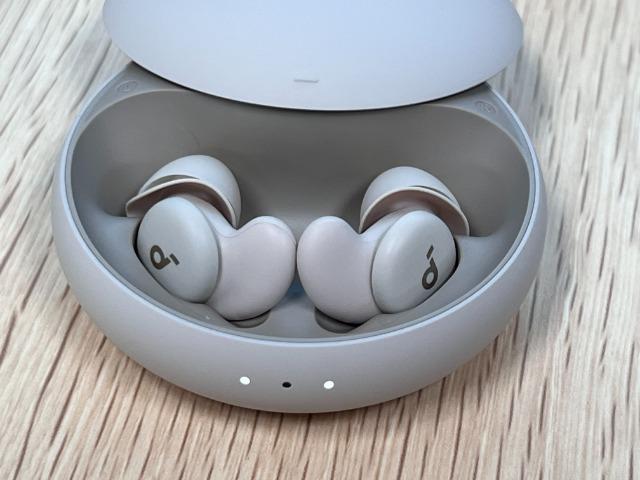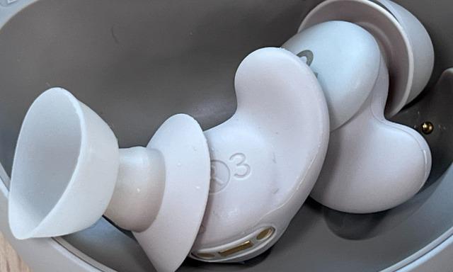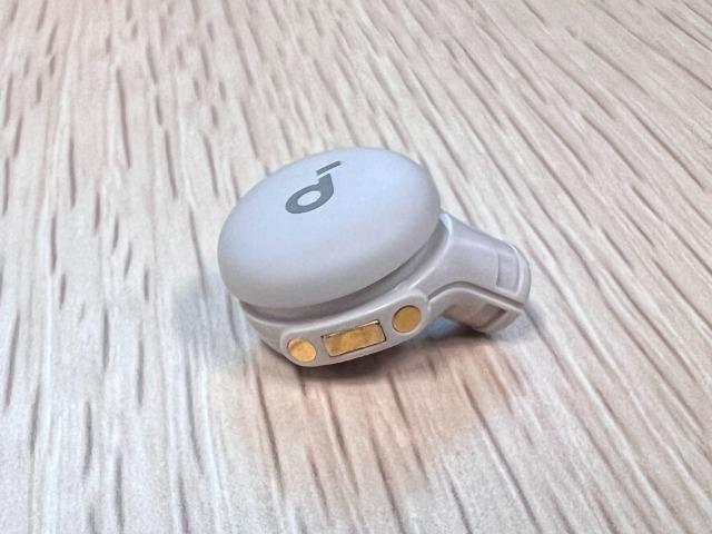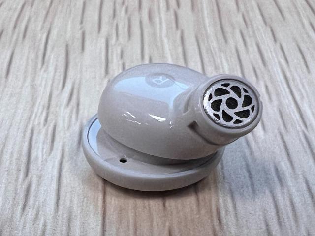 在充電盒的腔體內,耳機主體頭朝上的“側臥”著,一對氣囊耳翼翹起,如同翅膀一般。去除耳翼耳帽,裸機玲瓏輕巧,與黃豆大小差不多,且整體偏扁平,采用超分子親膚材料,如此一來能減少側睡時對耳道的壓迫。裸機的出音口也是別具一格,使用了兩層鋼網,里層網孔小可以防止耳道內的異物進入,外層網孔大一些,鏤空設計兼具藝術感。