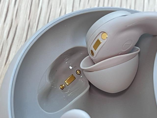 在裸機的側面有3個大小不一的磁吸接觸口,中間的較為寬大些,對于淺口的充電盒來說,能夠保證耳機與充電盒的穩固緊密貼合。