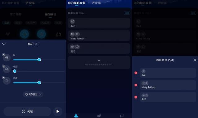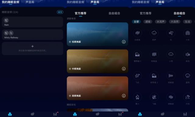 APP很簡潔,一共分為3個主菜單:聲音庫、Sleep A20、睡眠數據。聲音庫中擁有上百種白噪音,用戶可根據個人喜好選擇白噪音進行自由組合并傳輸至耳機,并可在我的睡眠音頻中對耳機已有的音頻進行刪除操作,實現花式助眠;